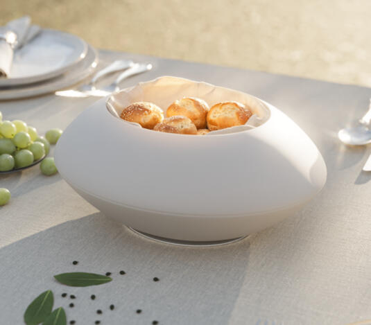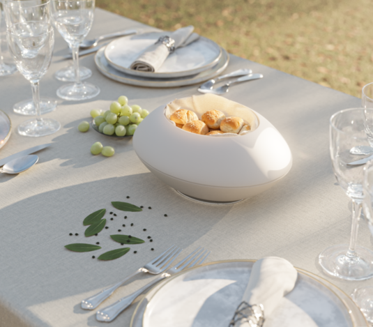 A cordless bread warmer designed to keep bread warm throughout dinner.
