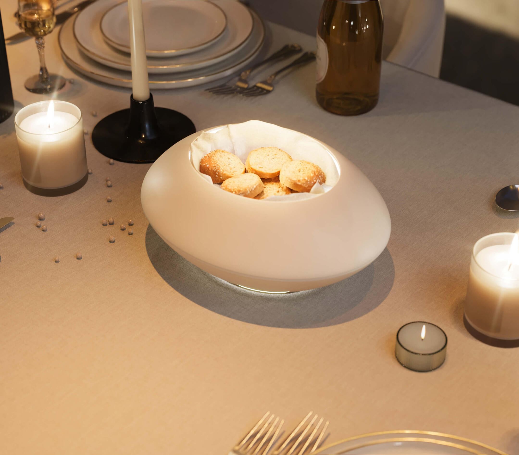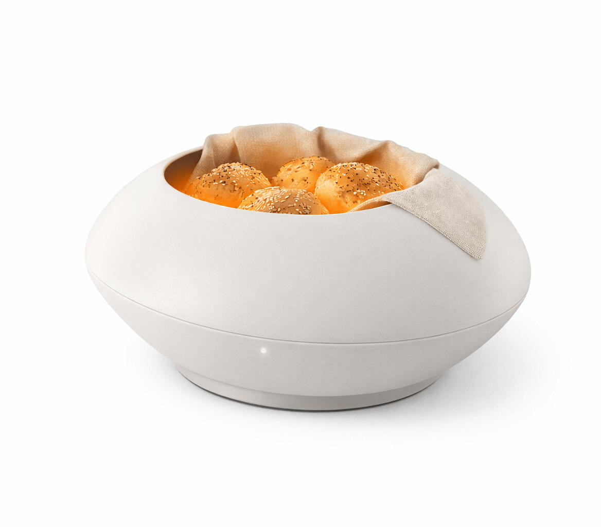 A cordless bread warmer designed to keep bread warm throughout dinner.